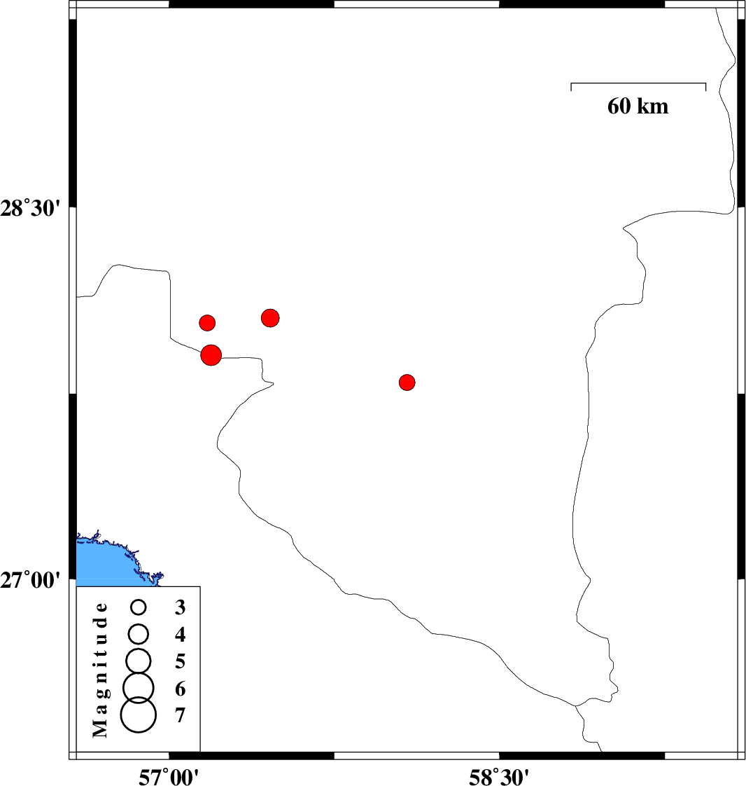 | 2024/12/29 | 13:04:08.8 | 16:34:08.8 | 28.055 | 57.459 | 10 | ML:3.7 | Kerman Province, 26 km North-West of Kahnuj |