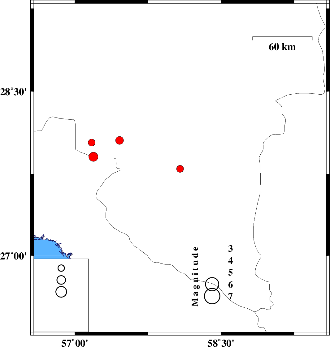 | 2025/01/01 | 17:10:49.6 | 20:40:49.6 | 27.796 | 58.08 | 12 | ML:3.3 | Kerman Province, 42 km South-East of Kahnuj | ||