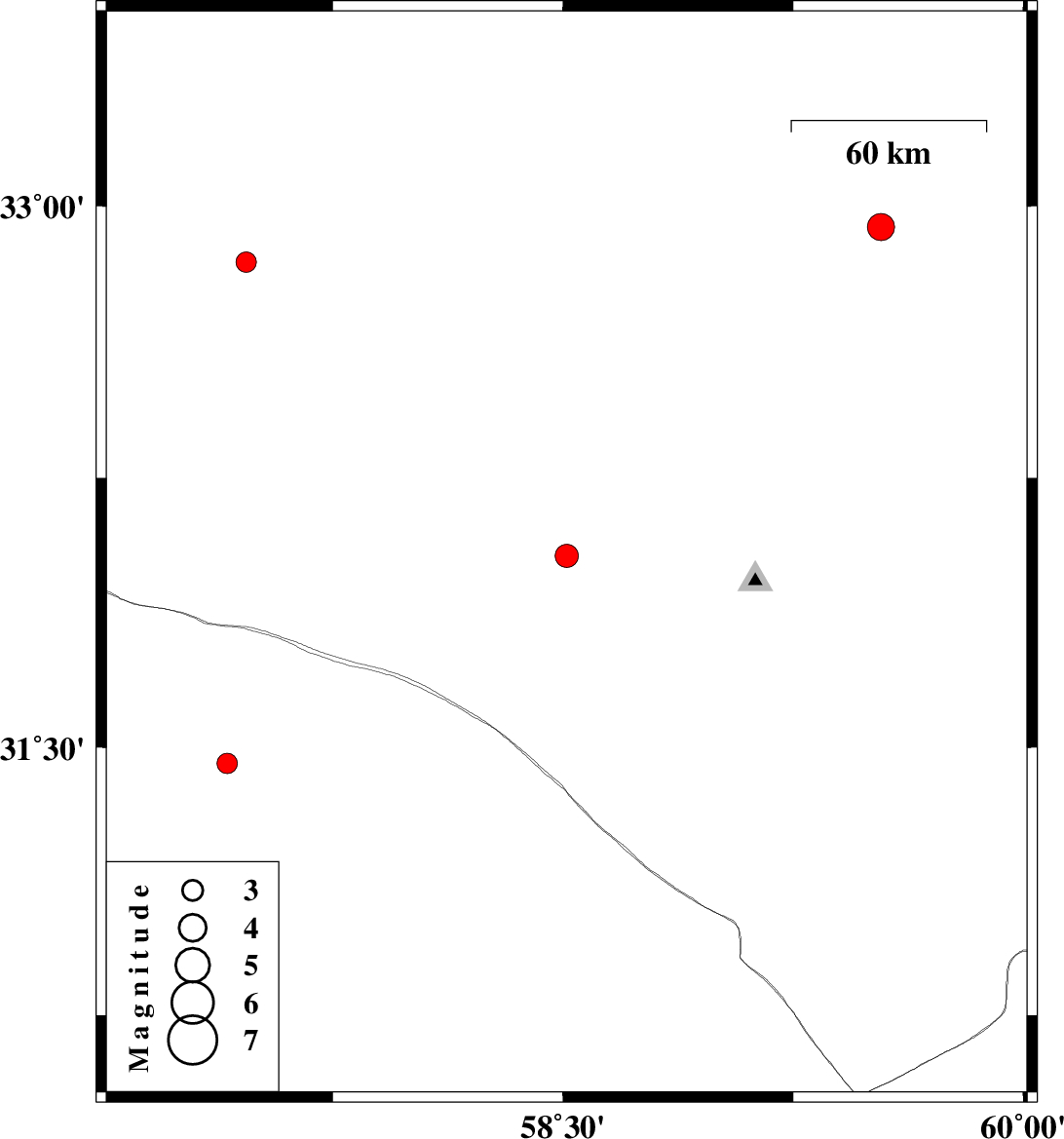 | 2024/12/26 | 08:33:20.3 | 12:03:20.3 | 31.456 | 57.405 | 10 | ML:3 | Kerman Province, 60 km North-East of Ravar | ||