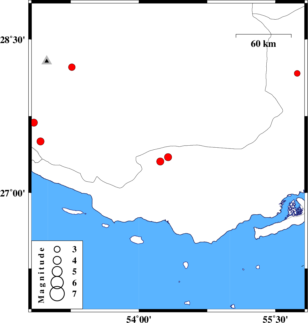 | 2025/01/26 | 00:13:30.9 | 03:43:30.9 | 27.349 | 54.32 | 31 | ML:3.6 | Hormozgan Province, 17 km North of Bastak | ||