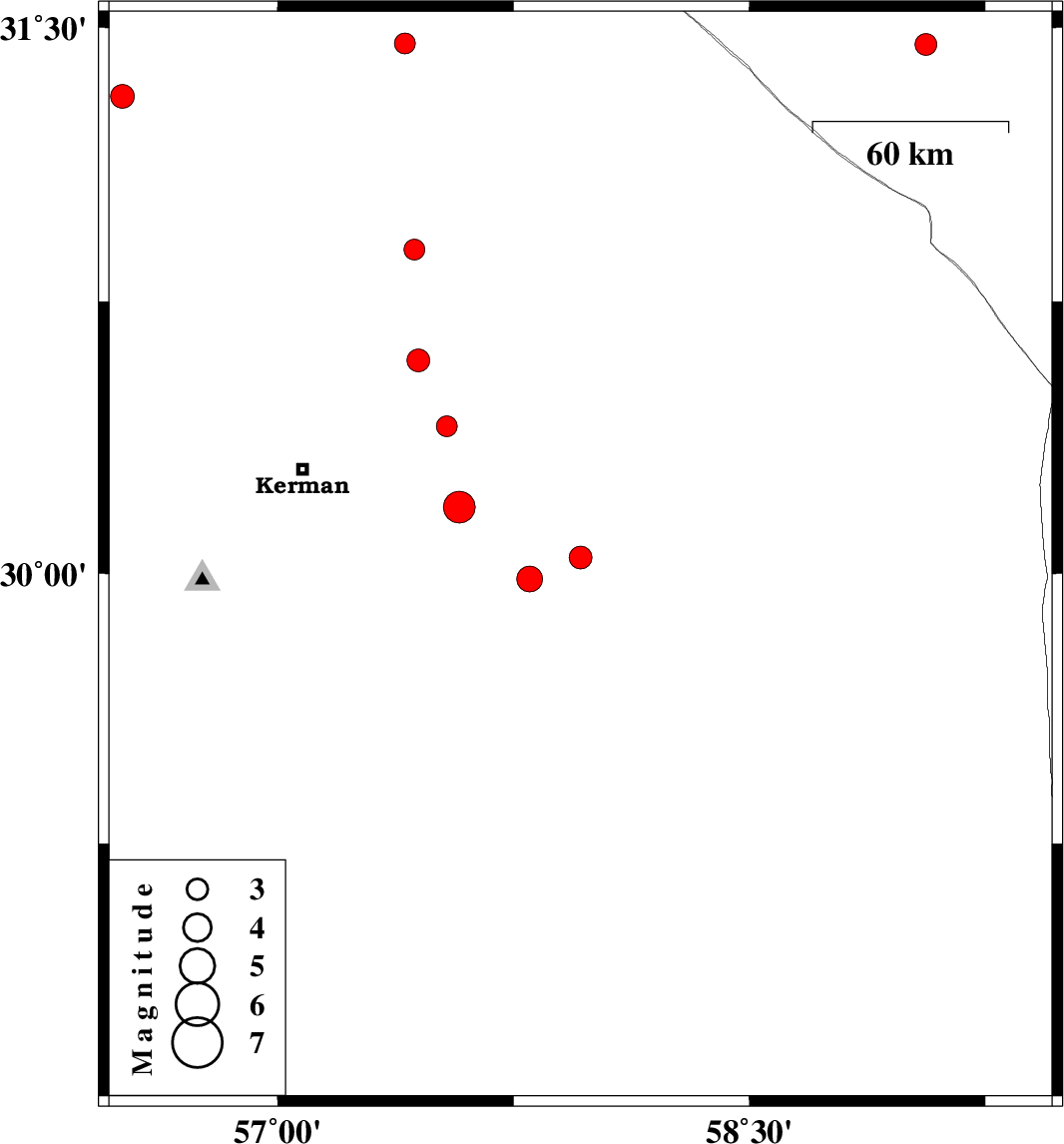 | 2025/01/17 | 07:35:01.9 | 11:05:01.9 | 29.984 | 57.802 | 12 | ML:3.7 | Kerman Province, 77 km South-East of Kerman | ||