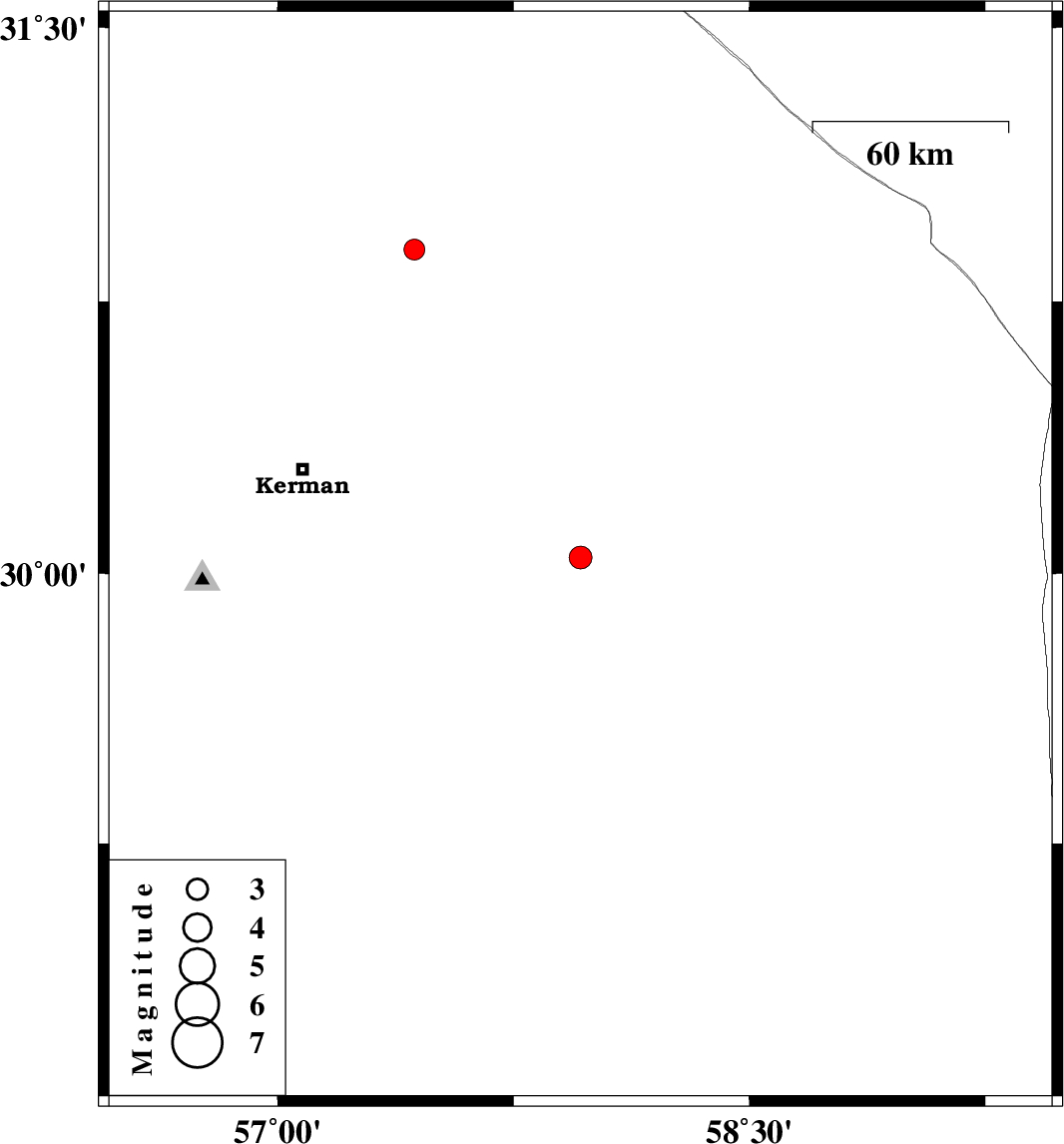 | 2025/01/25 | 15:15:59.0 | 18:45:59.0 | 30.044 | 57.963 | 12 | ML:3.2 | Kerman Province, 89 km South-East of Kerman | ||