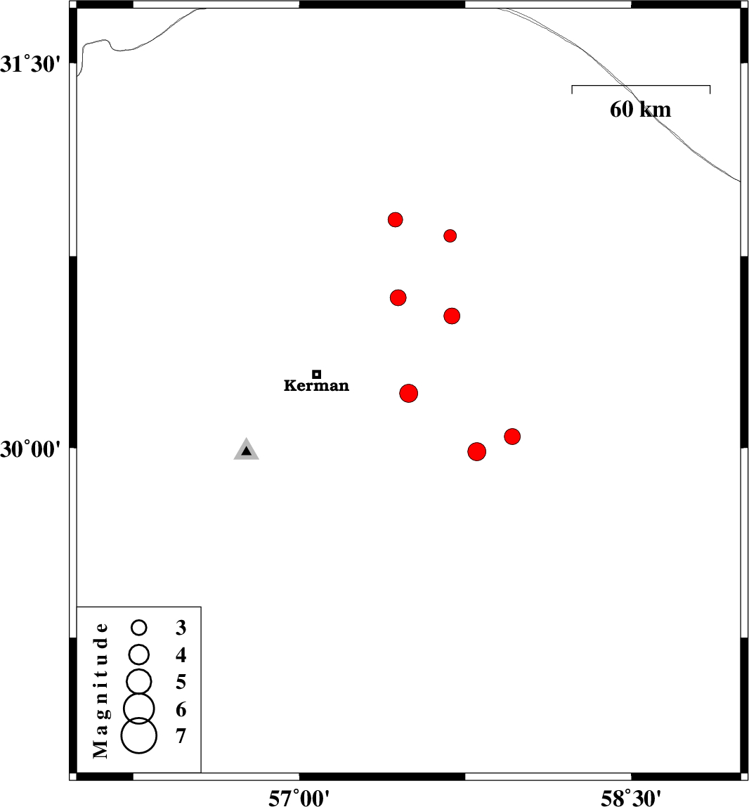 | 2025/01/17 | 07:35:01.9 | 11:05:01.9 | 29.984 | 57.802 | 12 | ML:3.7 | Kerman Province, 77 km South-East of Kerman |