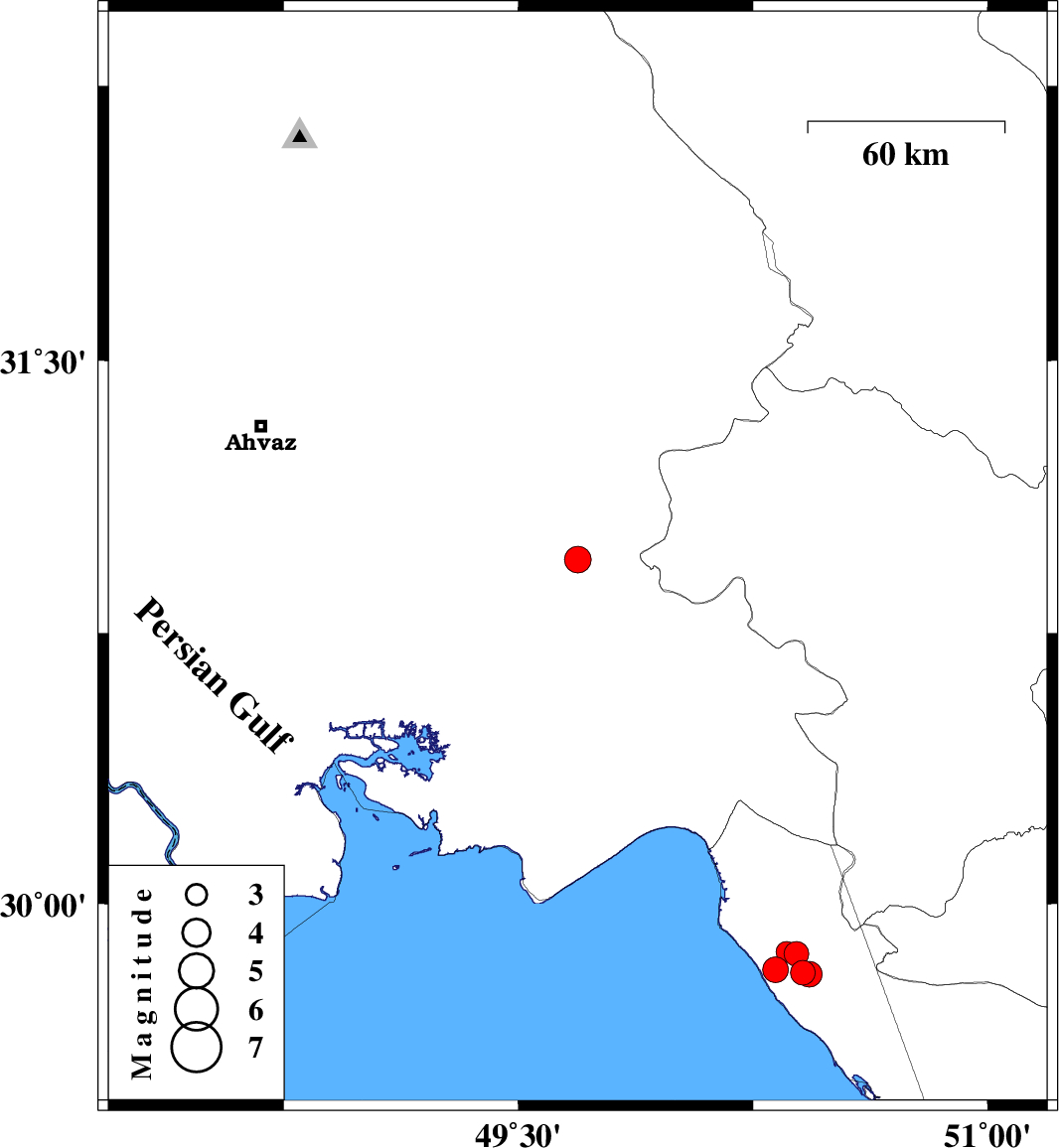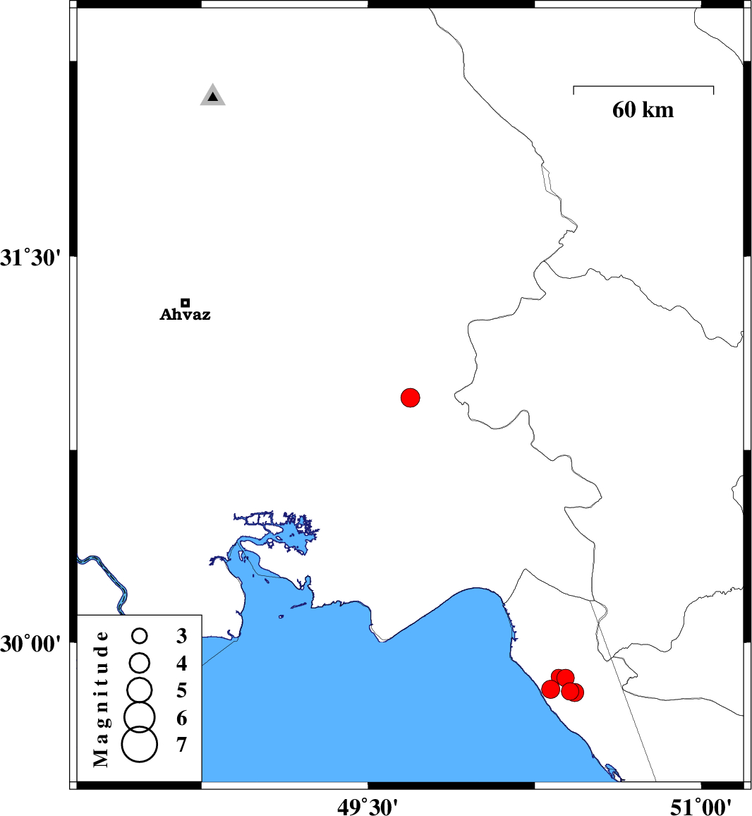 | 2025/03/09 | 14:13:42.5 | 17:43:42.5 | 29.866 | 50.357 | 12 | ML:3 | Khoozestan Province, 36 km North-West of Bandar-e genaveh |