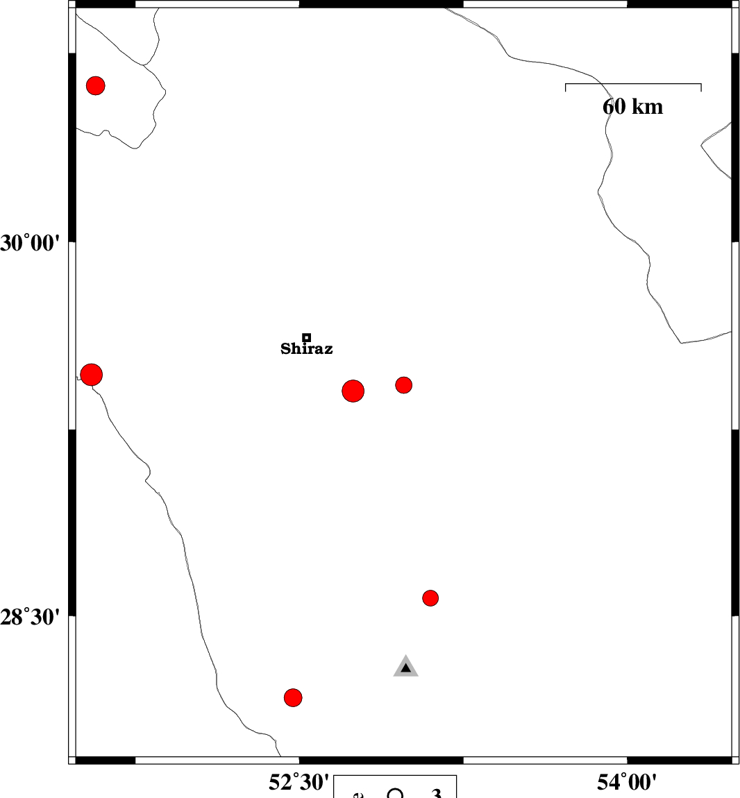 | 2025/04/08 | 23:42:20.0 | 03:12:20.0 | 29.429 | 52.977 | 12 | ML:3.4 | Fars Province, 52 km South-East of Marvdasht | ||