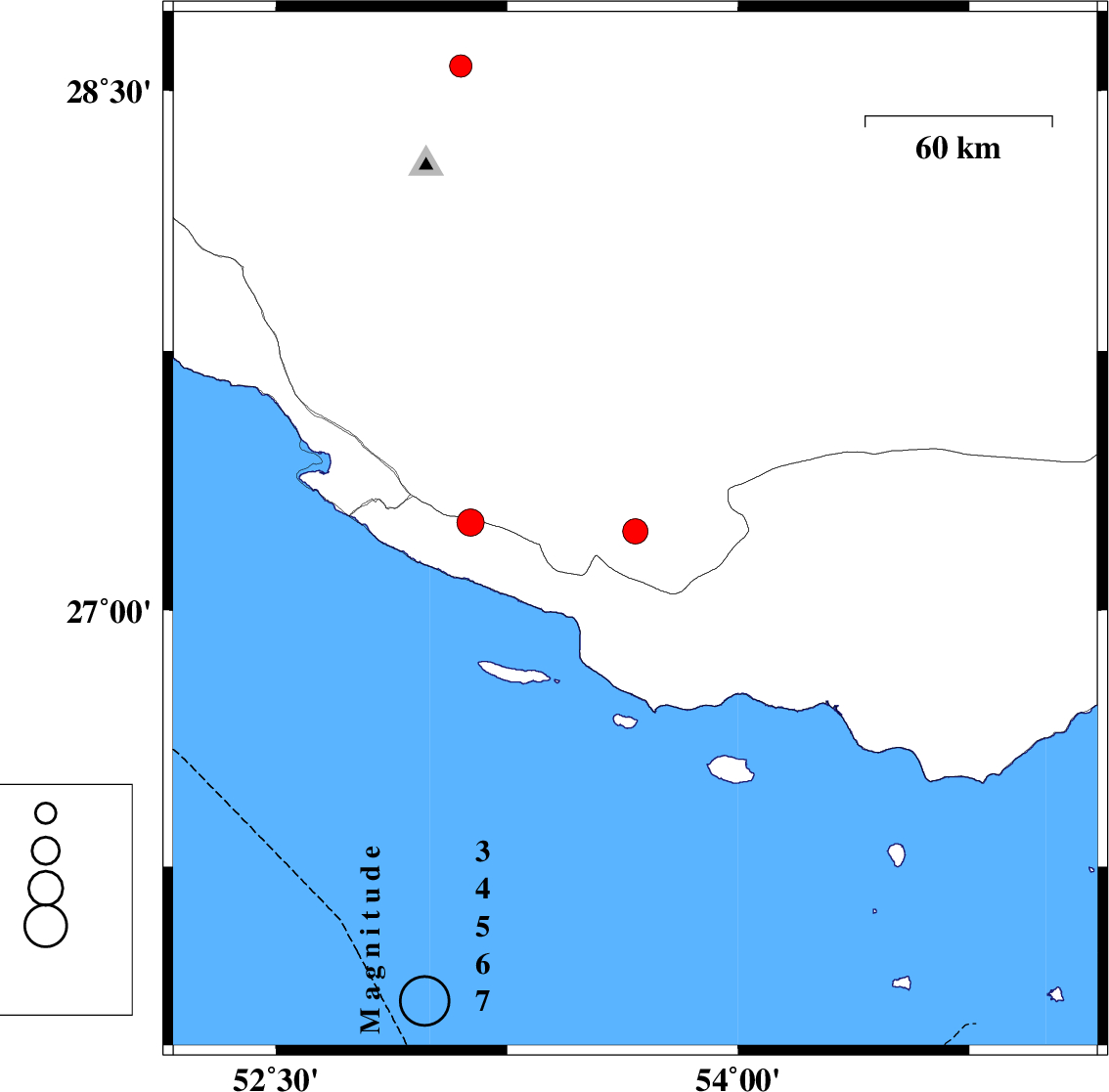 | 2025/04/07 | 19:28:29.4 | 22:58:29.4 | 28.571 | 53.099 | 12 | ML:3.3 | Fars Province, 13 km North of Qir va Karzin | ||