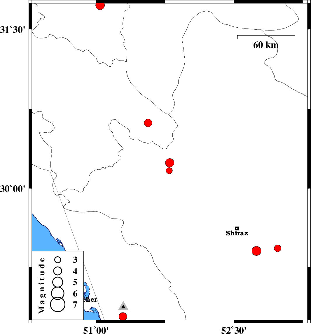 | 2025/04/05 | 12:27:18.7 | 15:57:18.7 | 28.775 | 51.292 | 24 | ML:4 | Bushehr Province, 12 km South of Ahram | ||