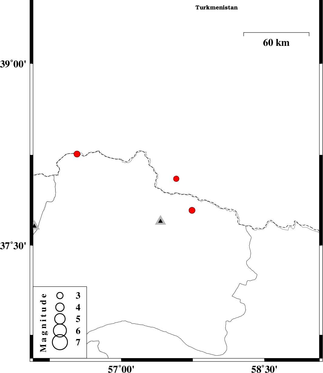 | 2025/04/26 | 15:33:19.3 | 19:03:19.3 | 38.053 | 57.576 | 12 | ML:2.7 | Turkmenistan, 68 km North-East of Bojnurd | ||