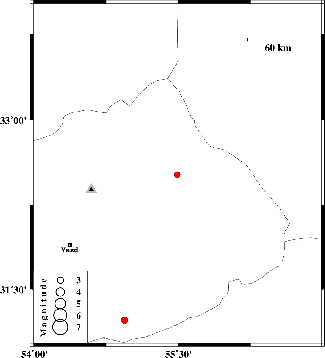 | 2025/04/29 | 10:57:40.8 | 14:27:40.8 | 31.225 | 54.938 | 12 | ML:3.2 | Yazd Province, 61 km South-West of Bafq |