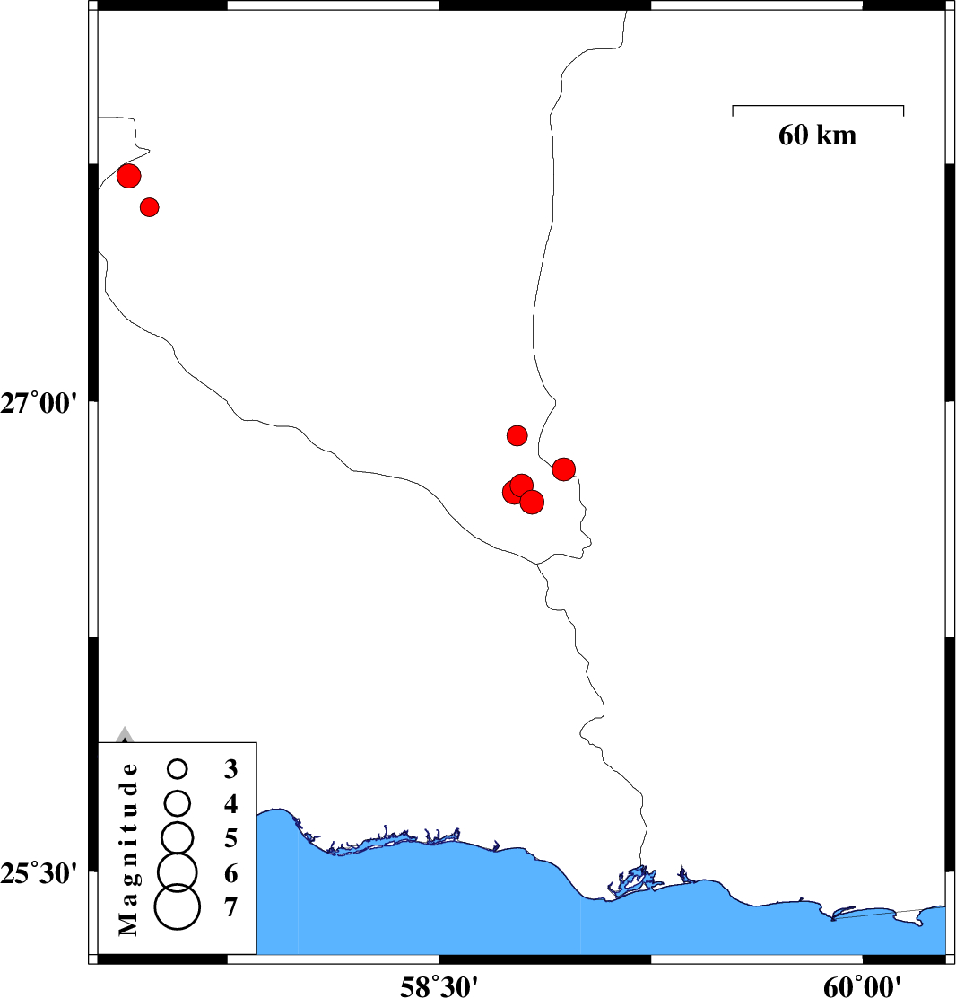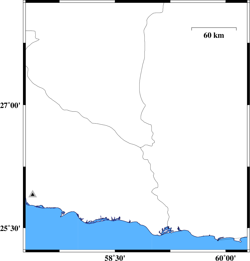 | 2025/05/15 | 07:23:04.1 | 10:53:04.1 | 26.711 | 58.766 | 16 | ML:3.8 | Kerman Province, 153 km North-West of Nikshahr | ||