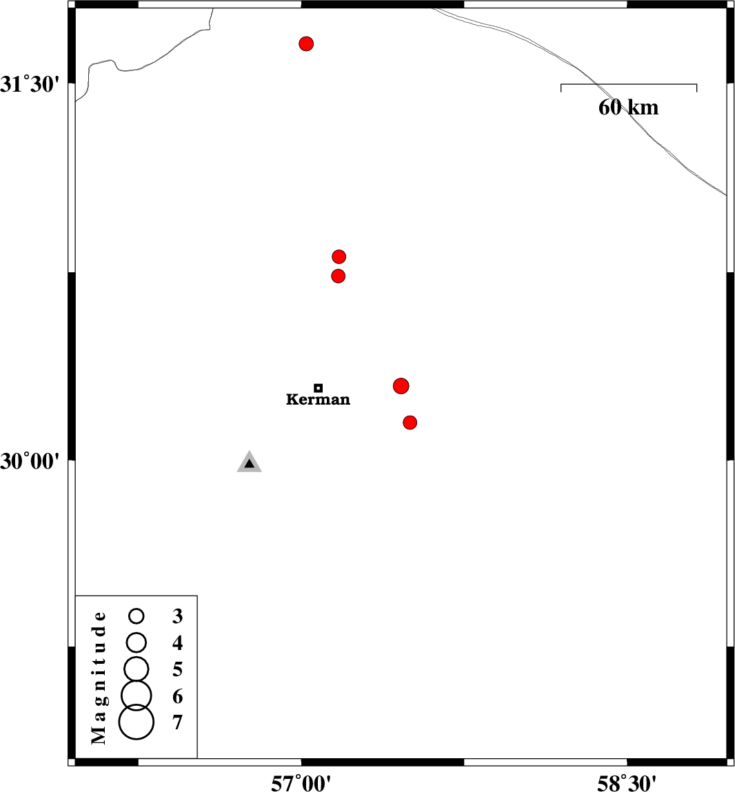 | 2025/05/11 | 19:38:27.8 | 23:08:27.8 | 30.15 | 57.501 | 12 | ML:2.8 | Kerman Province, 43 km South-East of Kerman | ||