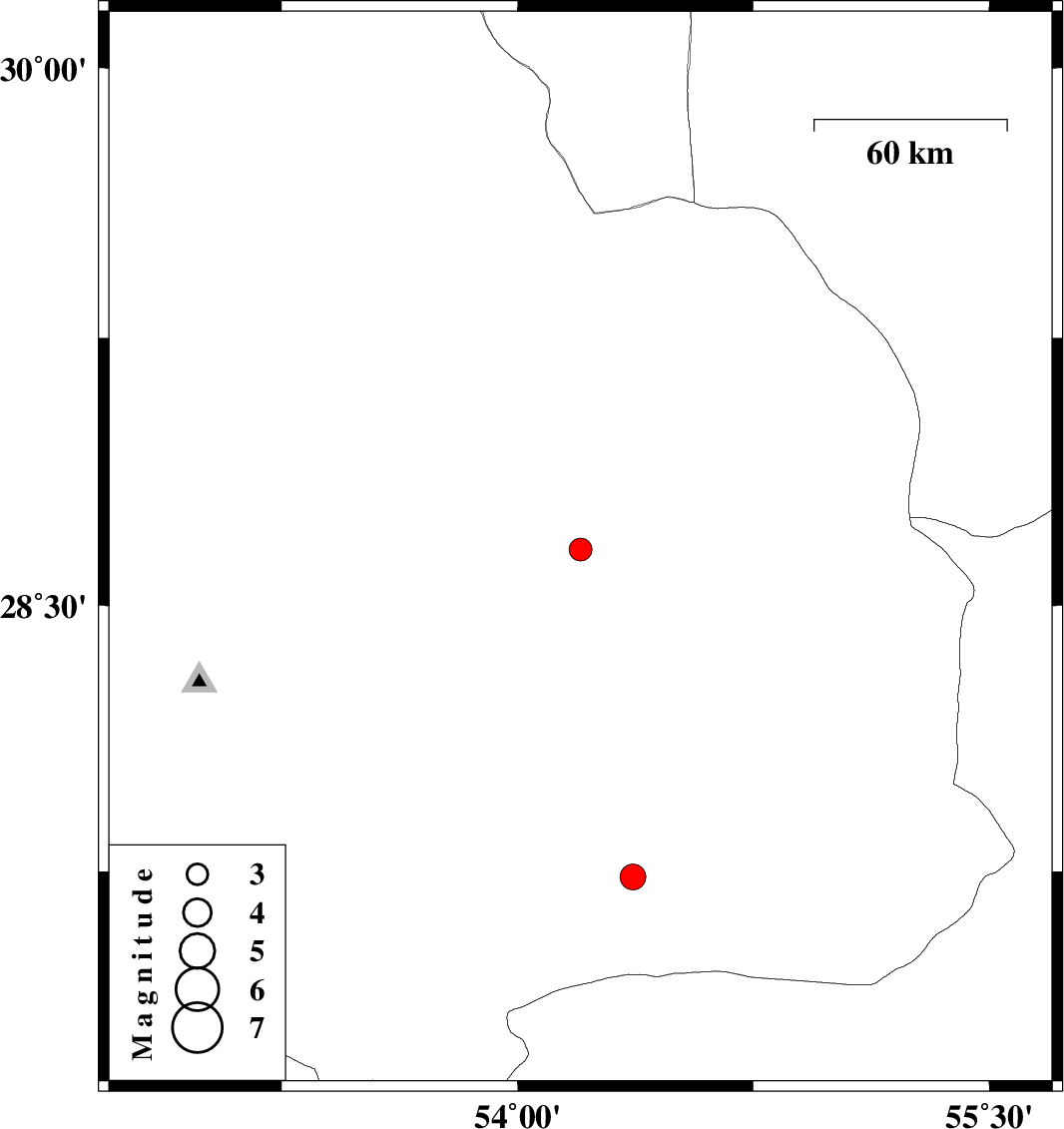 | 2025/06/09 | 13:08:11.2 | 16:38:11.2 | 28.657 | 54.2 | 12 | ML:3.2 | Fars Province, 34 km -West of Darab | ||