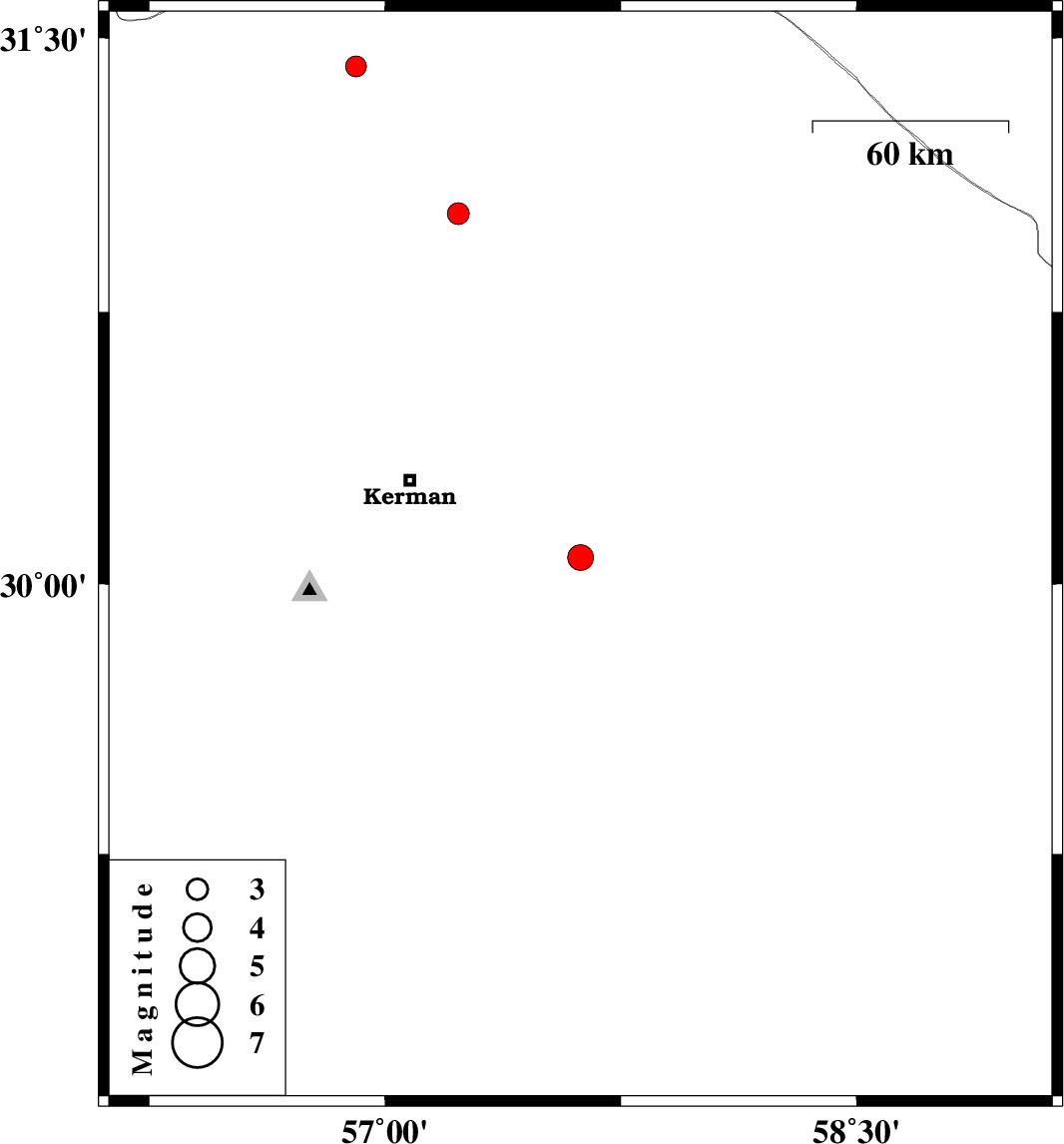 | 2025/05/27 | 11:20:26.2 | 14:50:26.2 | 31.02 | 57.234 | 9 | ML:3.1 | Kerman Province, 49 km South-East of Ravar |