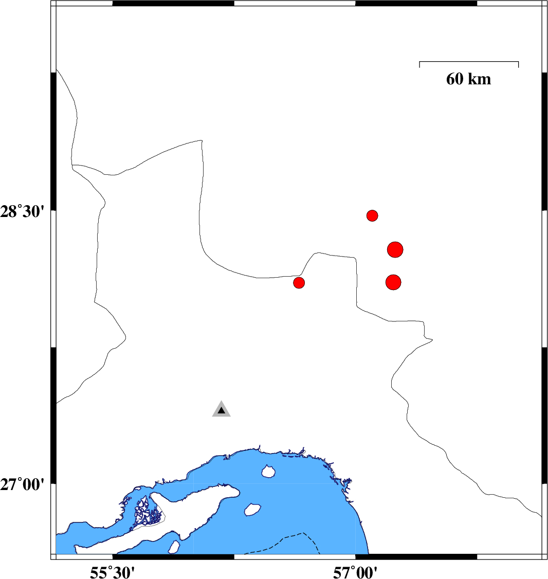 | 2025/06/24 | 16:03:40.6 | 19:33:40.6 | 28.109 | 56.65 | 17 | ML:3.1 | Hormozgan Province, 77 km South-East of Hajiabad | ||