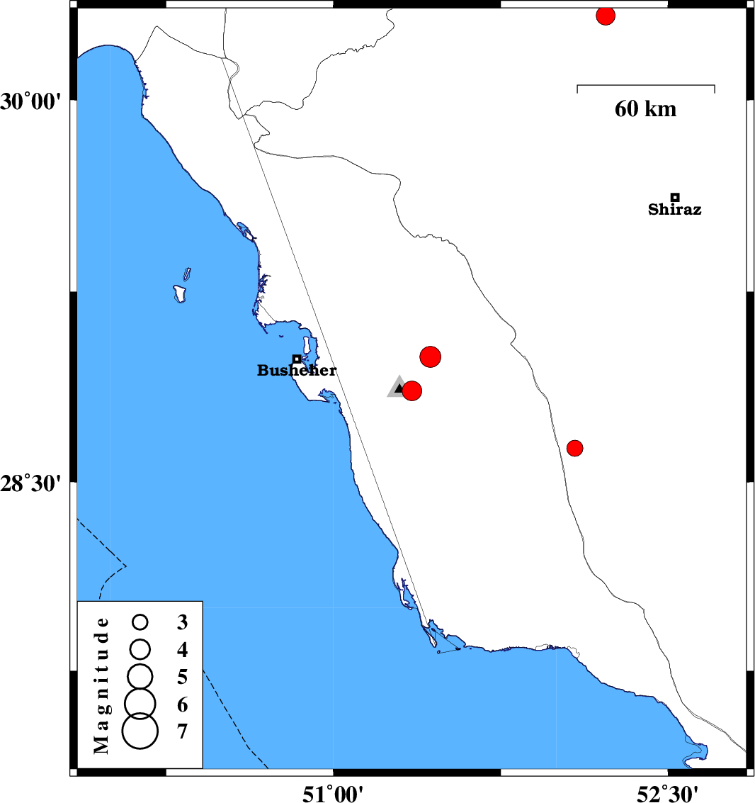 | 2025/06/17 | 15:25:38.0 | 18:55:38.0 | 28.994 | 51.434 | 12 | ML:4.2 | Bushehr Province, 21 km North-East of Ahram |