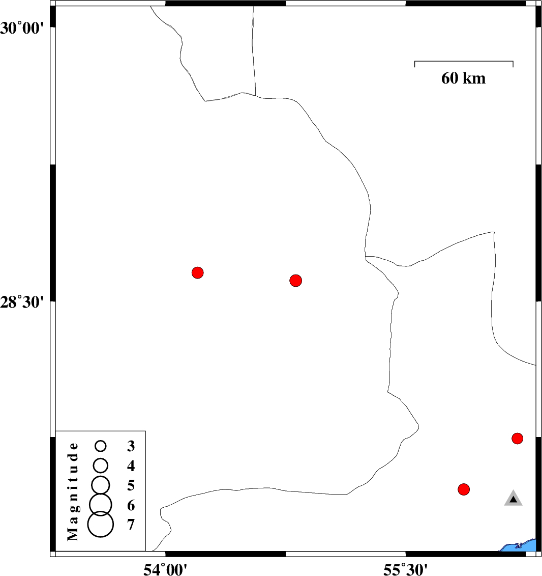 | 2025/06/09 | 13:08:11.2 | 16:38:11.2 | 28.657 | 54.2 | 12 | ML:3.2 | Fars Province, 34 km -West of Darab | ||