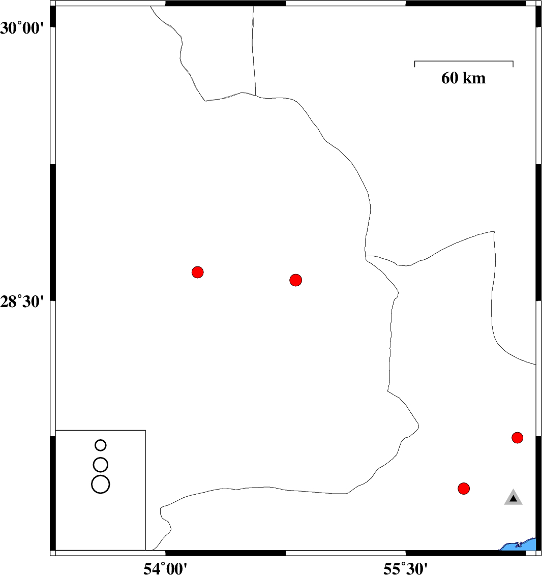 | 2025/06/17 | 12:18:24.7 | 15:48:24.7 | 28.614 | 54.812 | 12 | ML:3.4 | Fars Province, 31 km South-East of Darab | ||