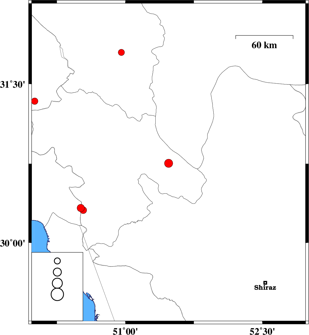 | 2025/07/29 | 22:12:38.6 | 01:42:38.6 | 30.753 | 51.473 | 12 | ML:4.1 | Kohkiluieh va boyerahmad Province, 13 km South of Sisakht | ||