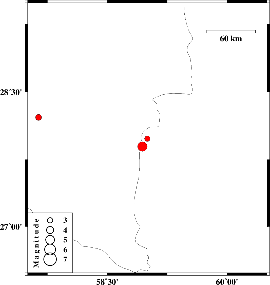 | 2025/08/07 | 05:51:34.8 | 09:21:34.8 | 27.981 | 59.001 | 12 | ML:3.1 | Sistan va Baloochestan Province, 128 km -East of Kahnuj | ||