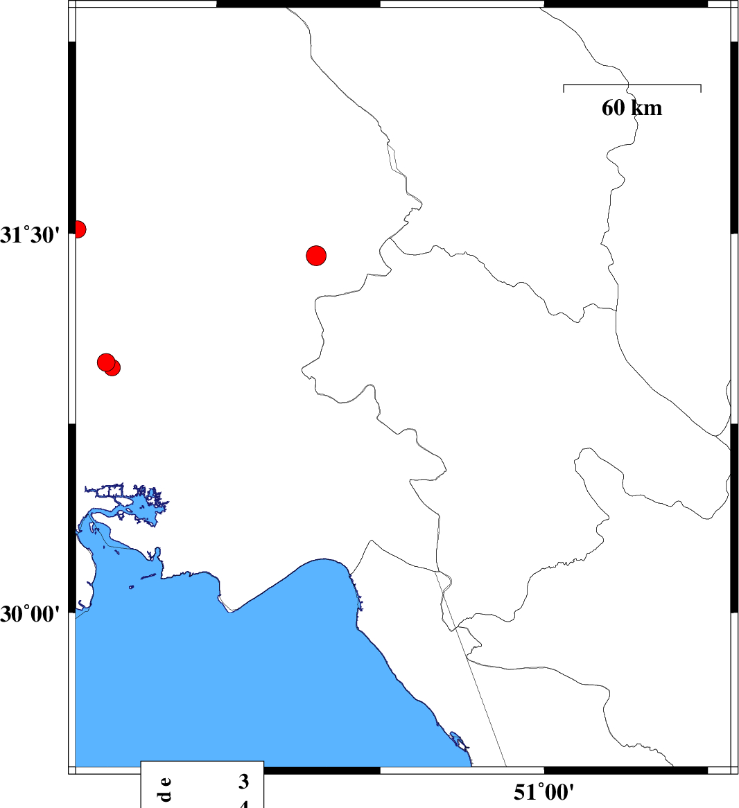 | 2025/07/29 | 22:12:38.6 | 01:42:38.6 | 30.753 | 51.473 | 12 | ML:4.1 | Kohkiluieh va boyerahmad Province, 13 km South of Sisakht | ||