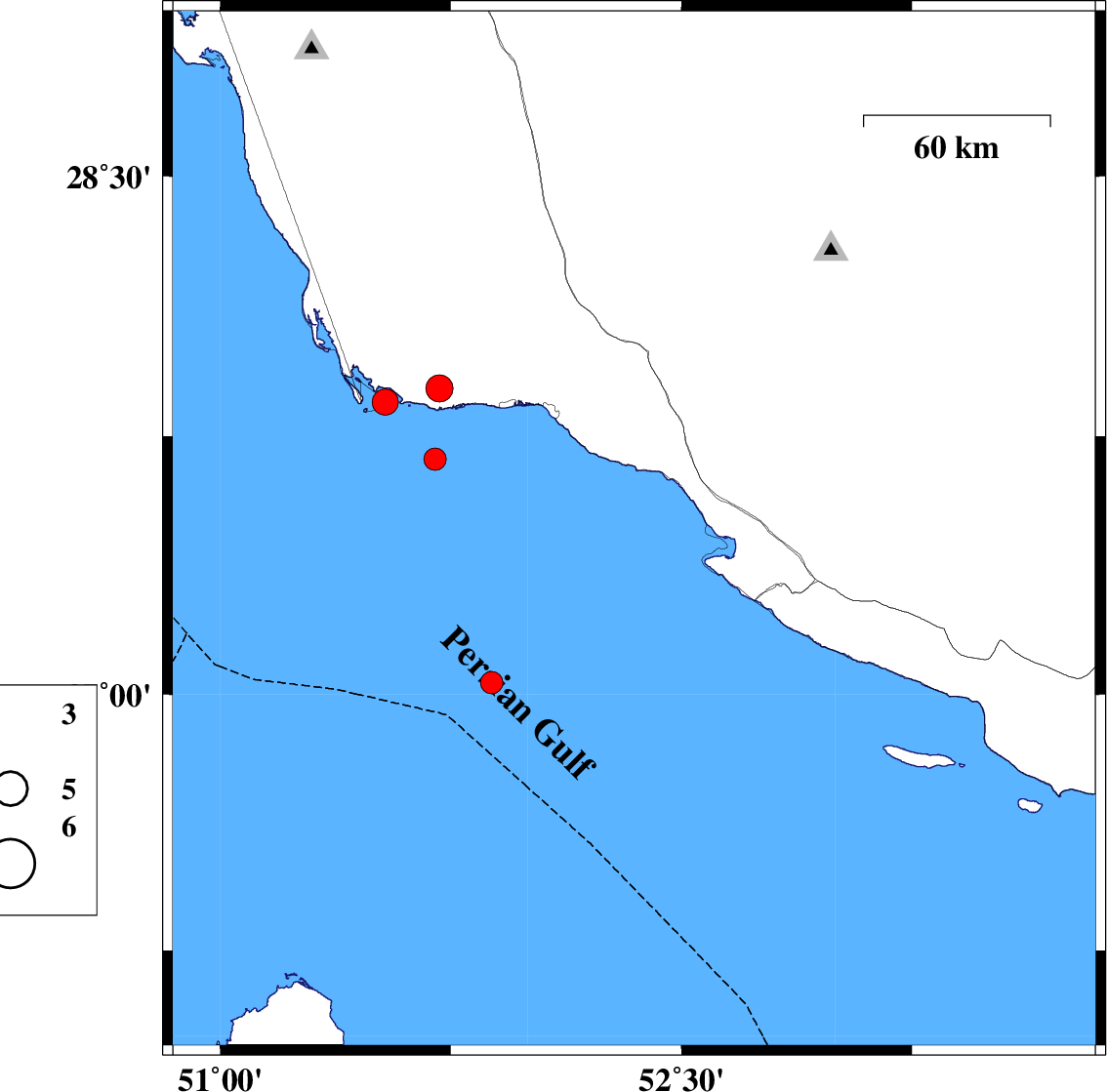 | 2025/08/29 | 17:14:40.4 | 20:44:40.4 | 27.307 | 52.509 | 12 | ML:3.3 | Persian Gulf, 46 km South-West of Mehr | ||