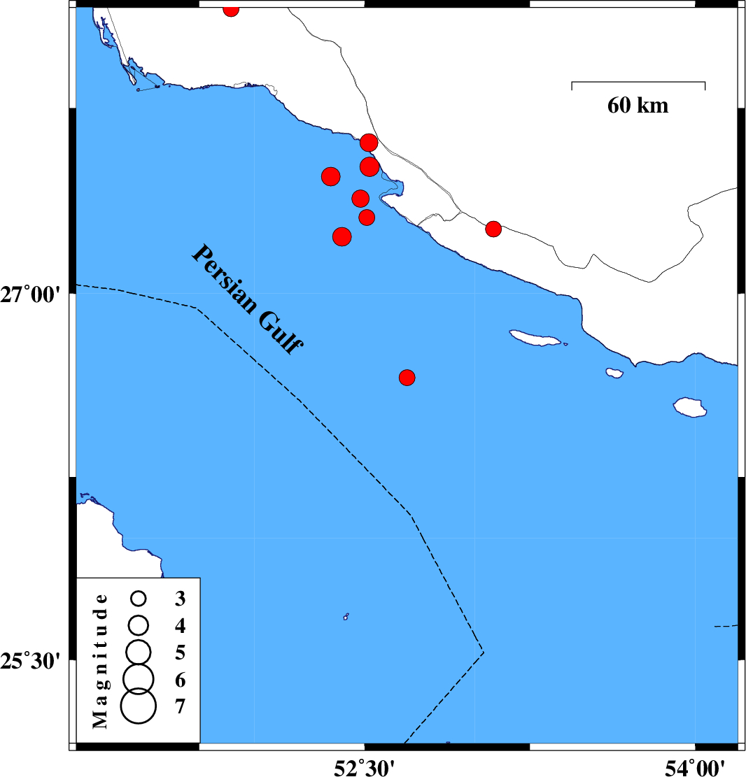 | 2025/08/29 | 13:11:51.5 | 16:41:51.5 | 27.474 | 52.346 | 12 | ML:3.8 | Persian Gulf, 40 km South of Jam | ||