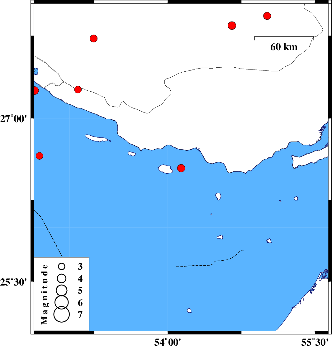 | 2025/09/03 | 08:45:33.3 | 12:15:33.3 | 27.252 | 52.643 | 12 | ML:3.6 | Persian Gulf, 41 km South-West of Mehr | ||
