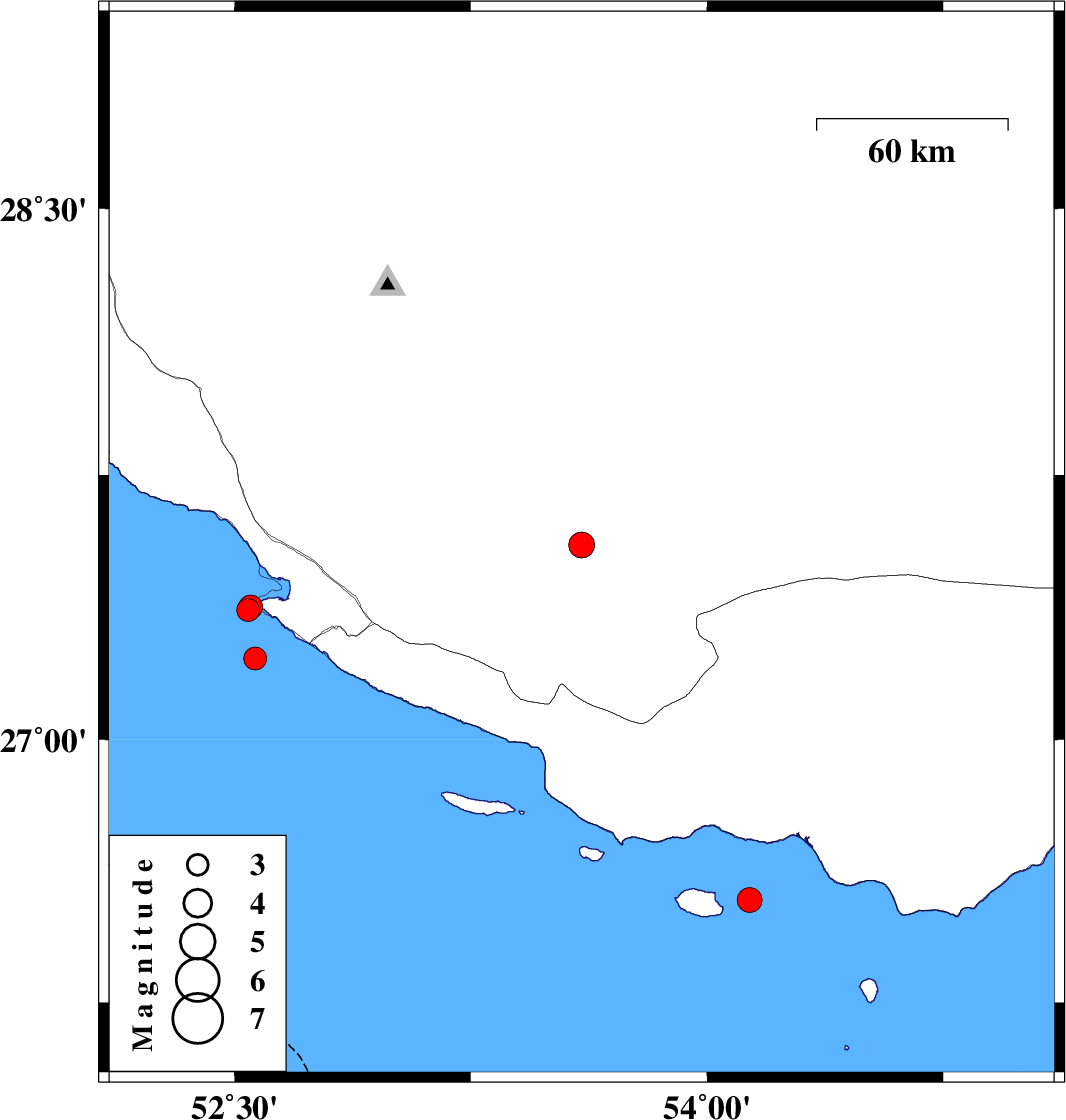 | 2025/09/10 | 22:28:31.7 | 01:58:31.7 | 27.368 | 52.544 | 12 | ML:3.3 | Persian Gulf, 39 km South-West of Mehr | ||
