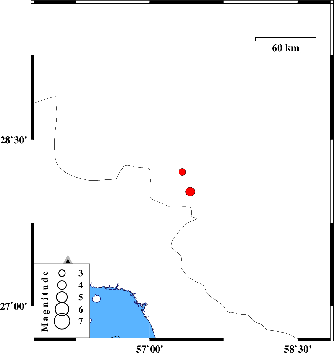 | 2025/09/12 | 06:51:42.1 | 10:21:42.1 | 28.209 | 57.33 | 12 | ML:3.2 | Kerman Province, 46 km North-West of Kahnuj | ||