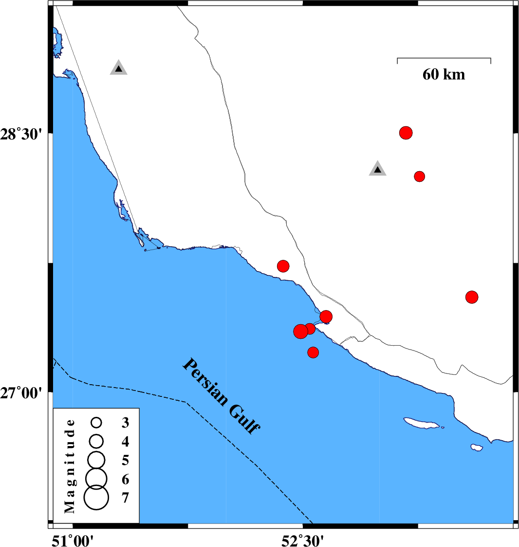 | 2025/09/15 | 21:03:21.7 | 00:33:21.7 | 27.352 | 52.486 | 12 | ML:4.2 | Persian Gulf, 45 km South-West of Mehr | ||