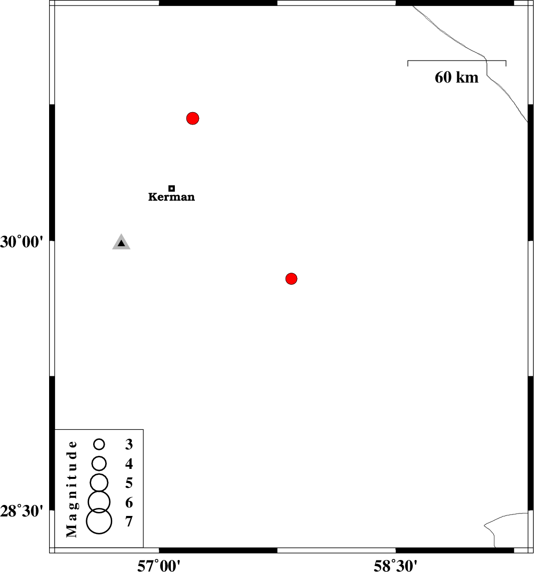 | 2025/09/22 | 07:56:58.3 | 11:26:58.3 | 29.79 | 57.838 | 12 | ML:3.3 | Kerman Province, 91 km North-West of Bam | ||