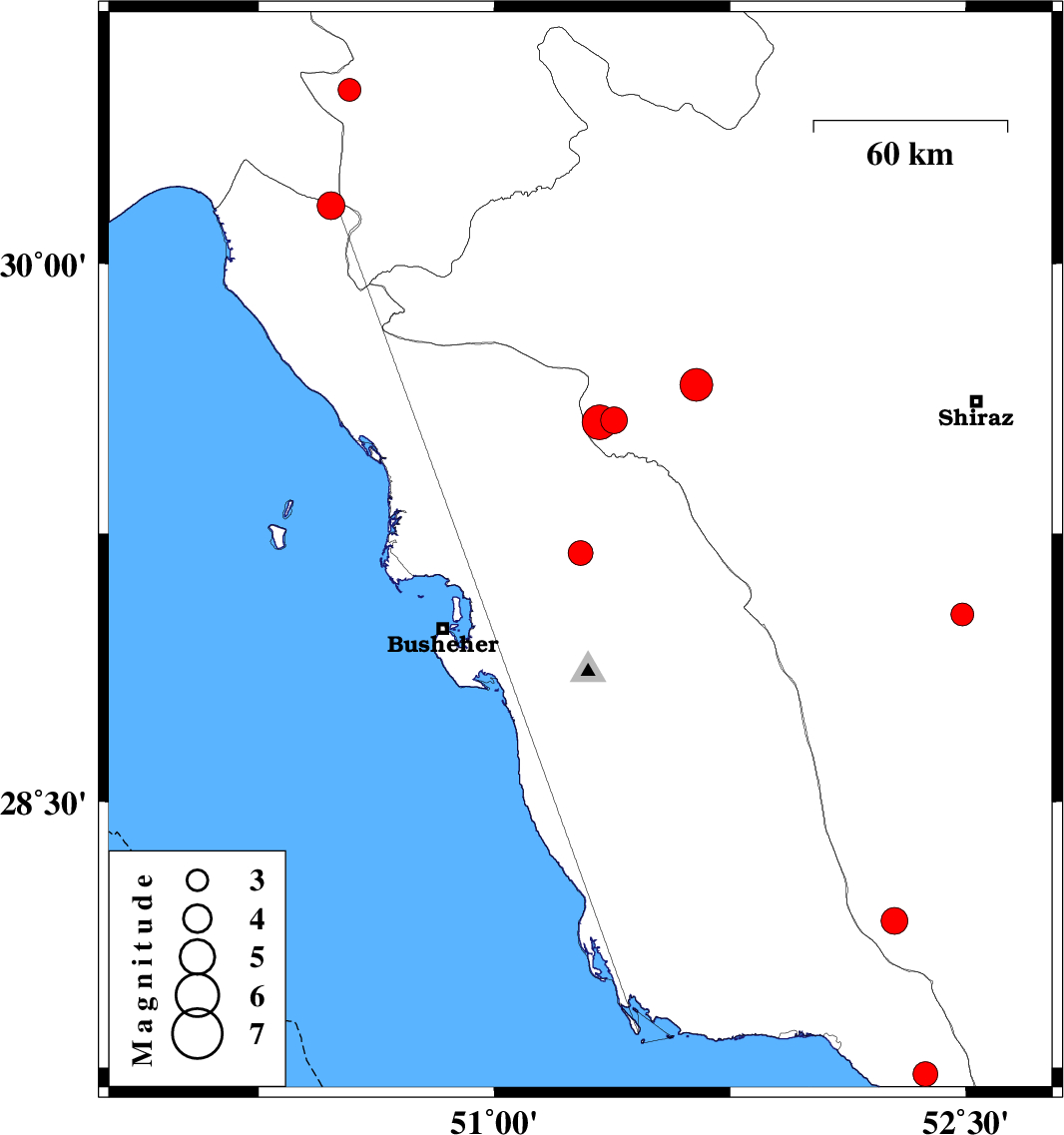 | 2025/09/13 | 12:37:26.2 | 16:07:26.2 | 29.56 | 51.334 | 12 | ML:4.9 | Fars Province, 32 km -West of Kazerun |
