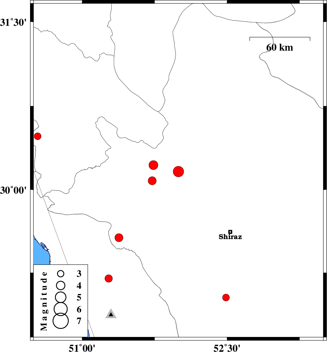 | 2025/10/07 | 07:53:09.4 | 11:23:09.4 | 29.566 | 51.38 | 17 | ML:3.8 | Fars Province, 27 km -West of Kazerun | ||