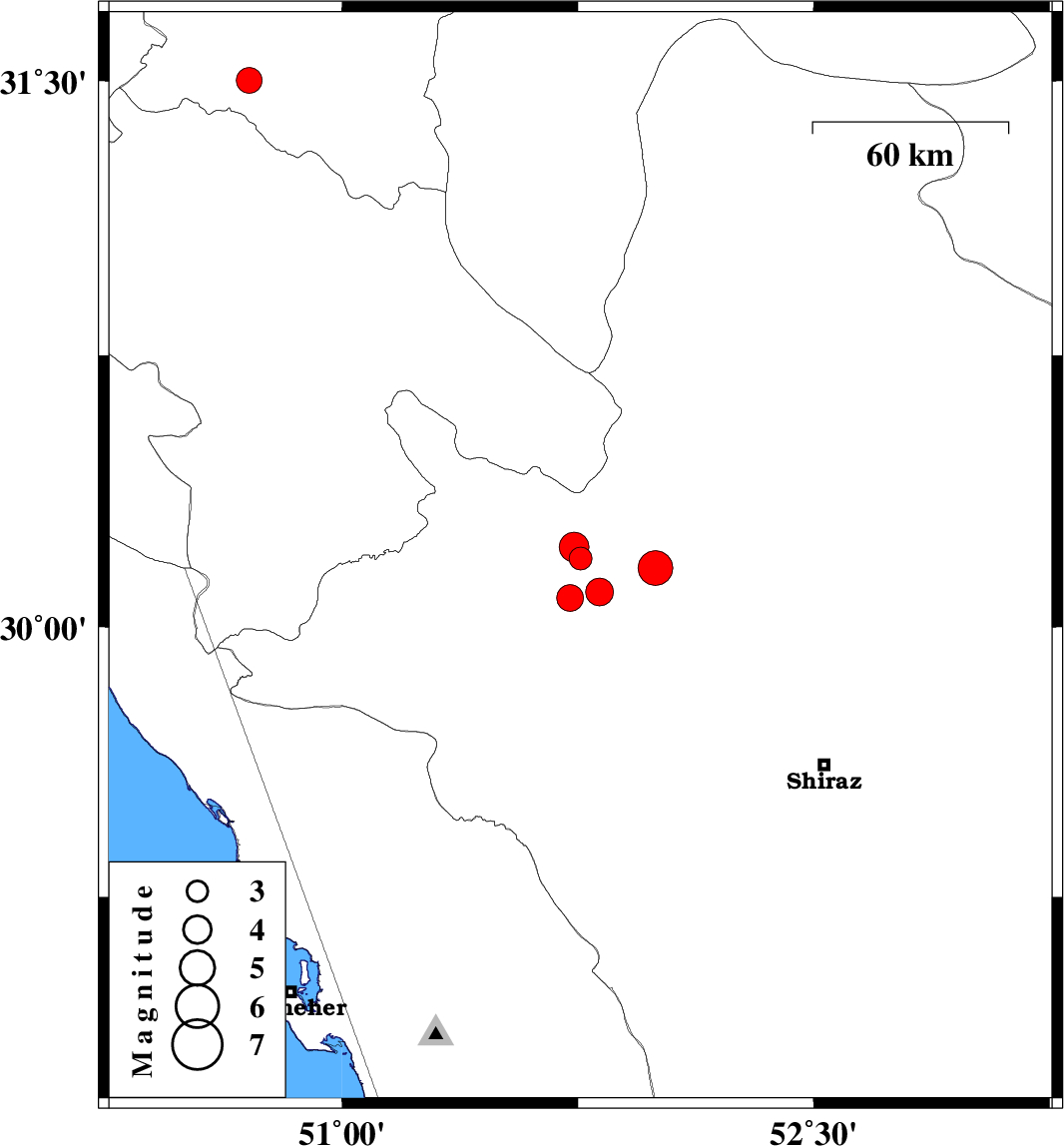 | 2025/10/19 | 03:12:05.8 | 06:42:05.8 | 30.08 | 51.725 | 12 | ML:3.8 | Fars Province, 20 km -East of Nurabad |