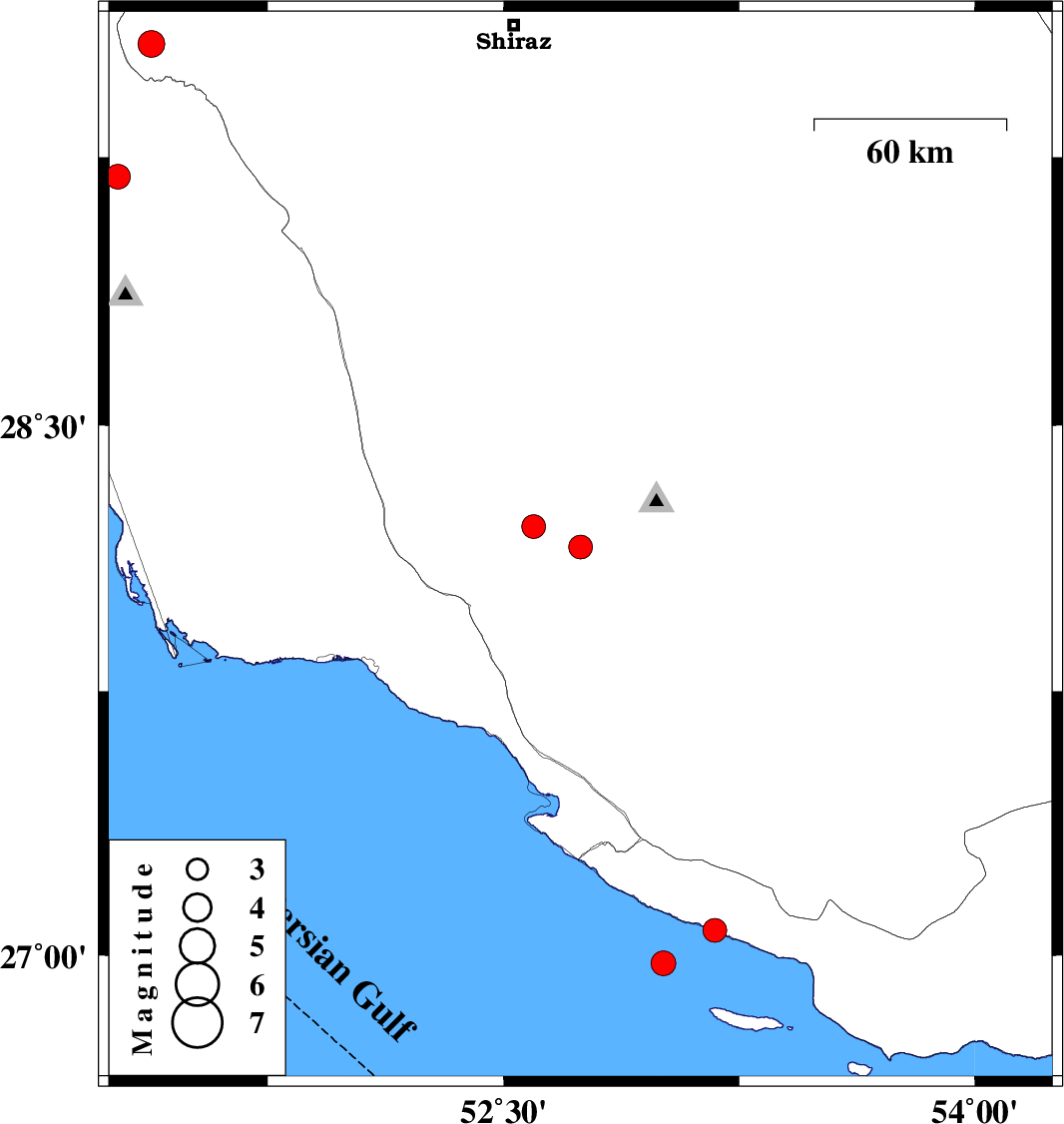 | 2025/10/07 | 07:53:09.4 | 11:23:09.4 | 29.566 | 51.38 | 17 | ML:3.8 | Fars Province, 27 km -West of Kazerun |