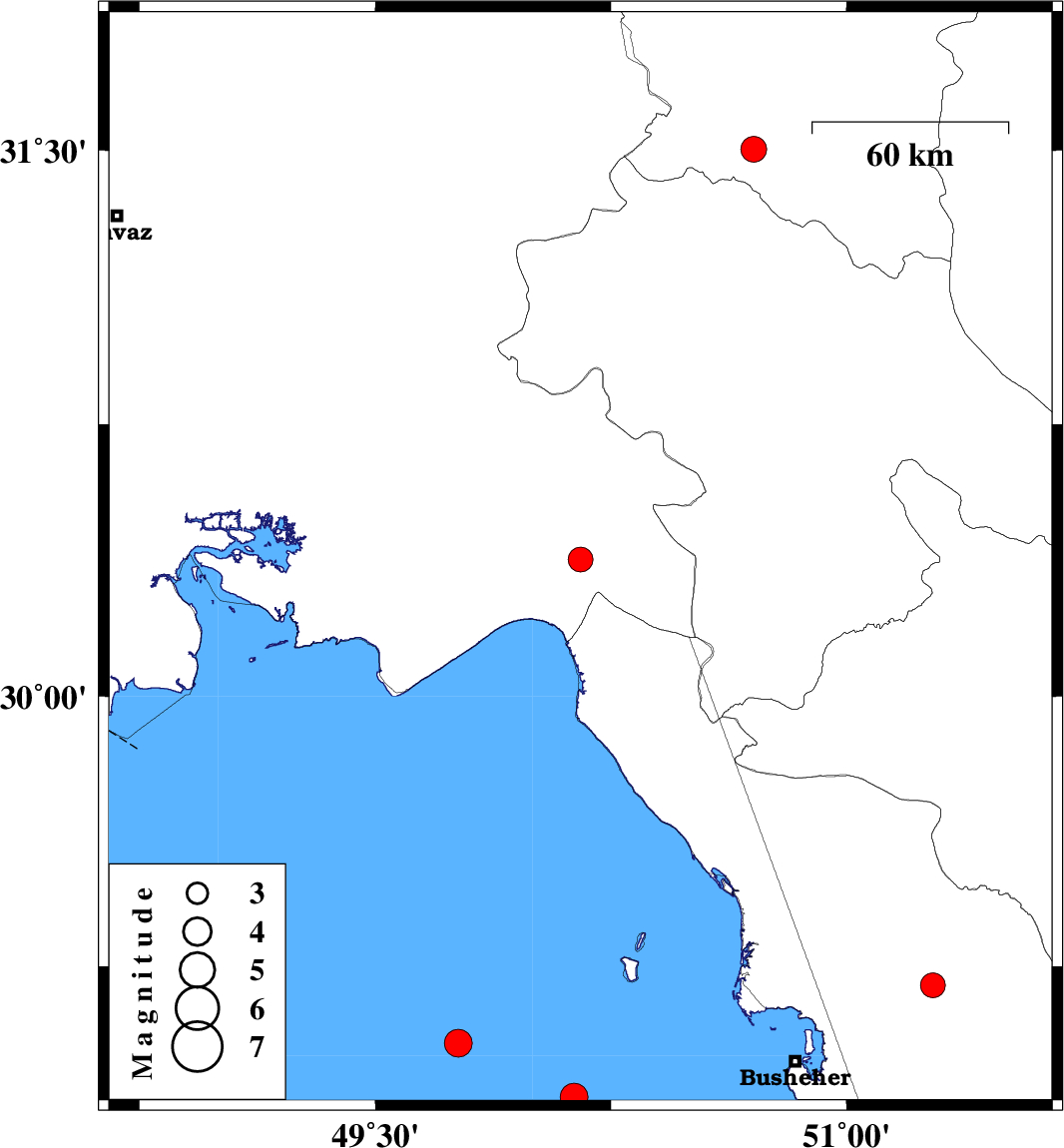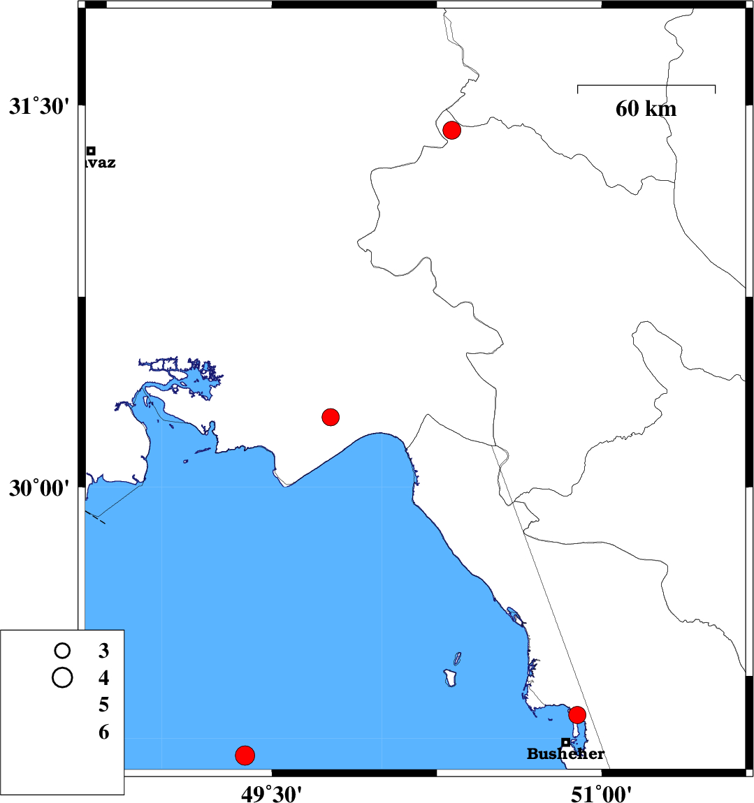 | 2025/11/10 | 12:22:09.6 | 15:52:09.6 | 28.884 | 50.133 | 12 | ML:3.9 | Persian Gulf, 69 km South-West of Busheher | ||