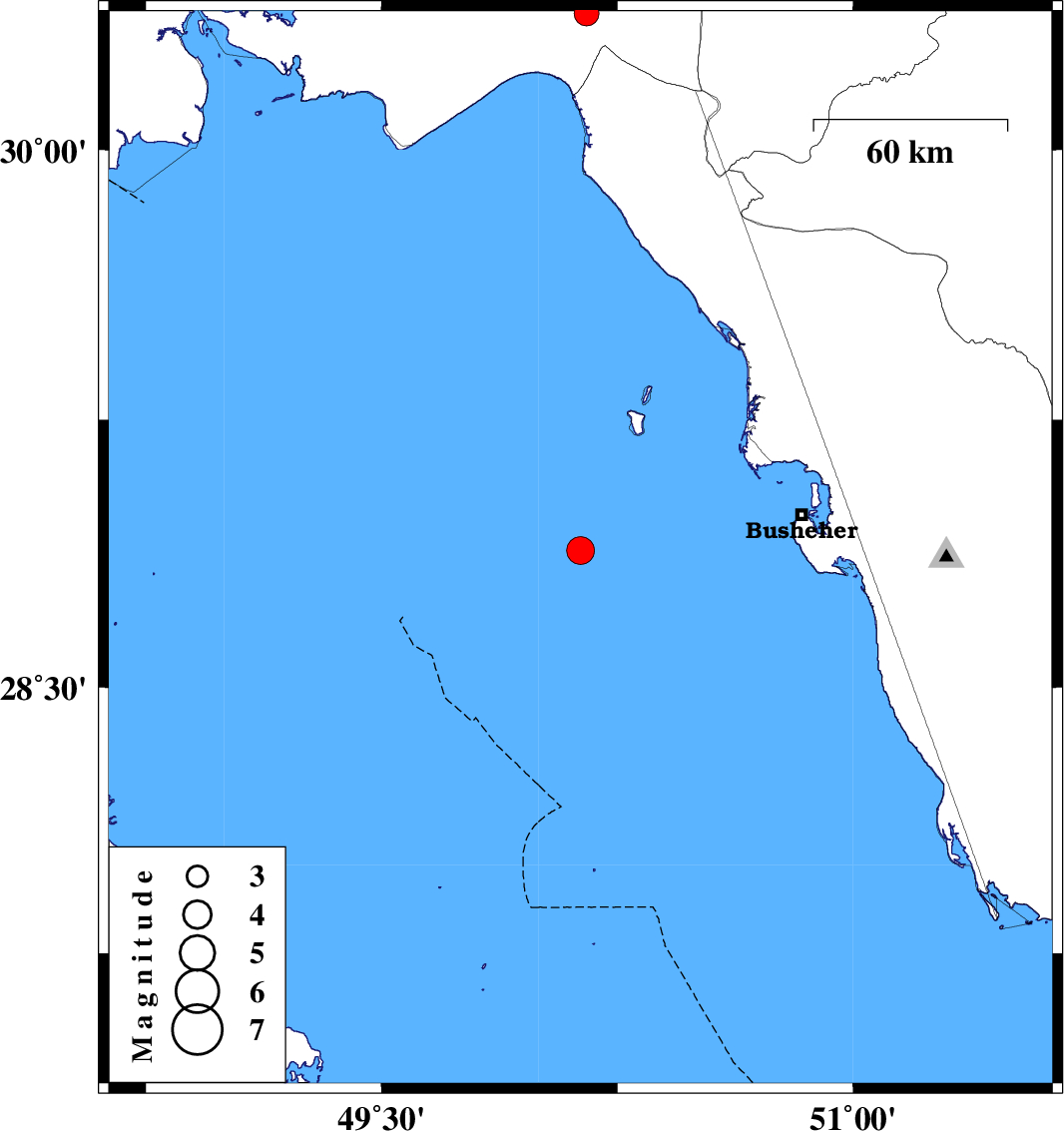 | 2025/11/10 | 12:22:09.6 | 15:52:09.6 | 28.884 | 50.133 | 12 | ML:3.9 | Persian Gulf, 69 km South-West of Busheher | ||