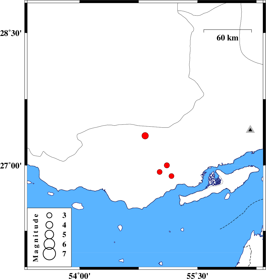 | 2025/11/21 | 00:16:33.6 | 03:46:33.6 | 27 | 55.11 | 12 | ML:3.1 | Hormozgan Province, 59 km North-East of Bandar-e lengeh |