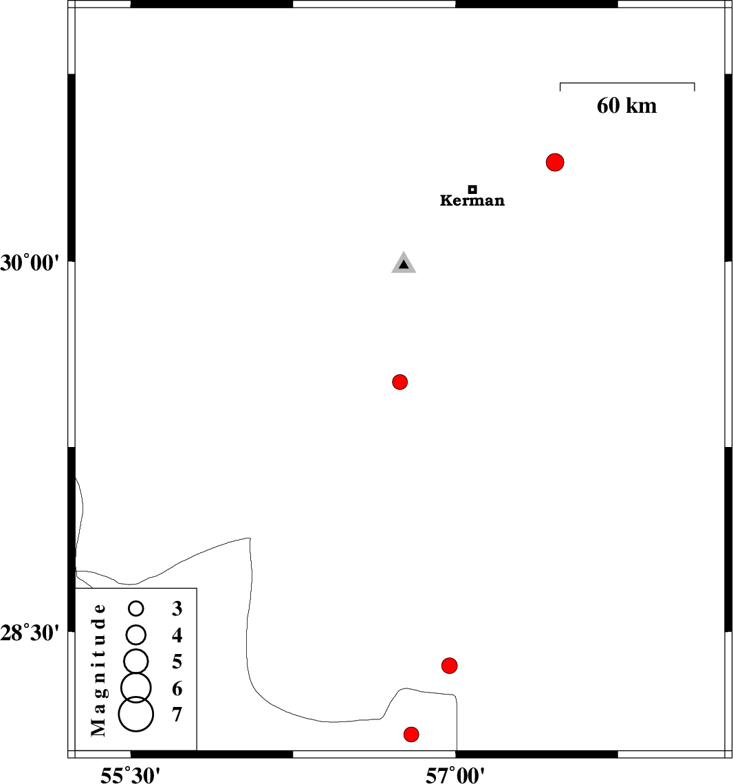 | 2025/11/25 | 10:35:09.9 | 14:05:09.9 | 29.514 | 56.743 | 12 | ML:3.1 | Kerman Province, 34 km North-East of Baft | ||