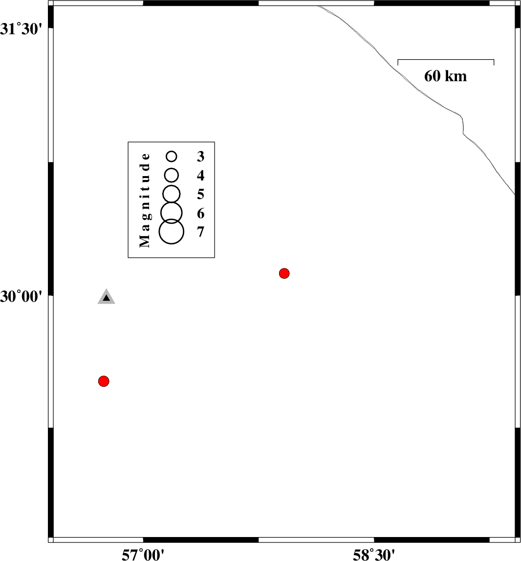 | 2025/12/06 | 23:13:02.1 | 02:43:02.1 | 30.124 | 57.916 | 12 | ML:2.9 | Kerman Province, 82 km South-East of Kerman | ||