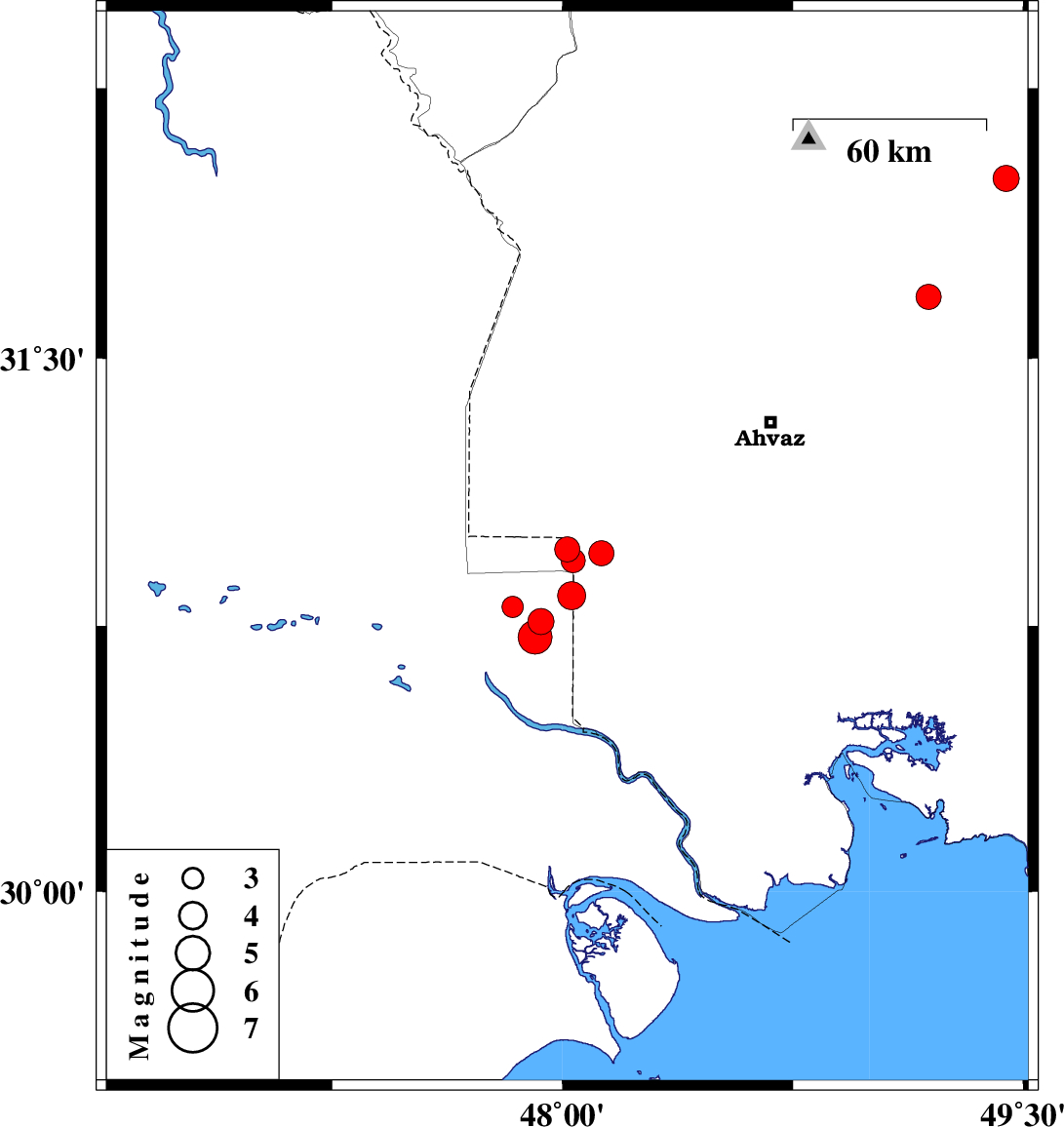 | 2026/01/12 | 08:50:01.9 | 12:20:01.9 | 30.933 | 48.034 | 12 | ML:3.5 | Khoozestan Province, 51 km North-East of Al Basrah | ||