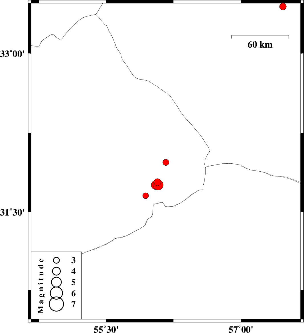 | 2026/01/13 | 18:13:31.1 | 21:43:31.1 | 31.756 | 56.08 | 15 | ML:5.1 | Yazd Province, 67 km North-East of Bafq | ||