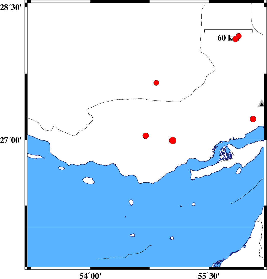 | 2026/01/05 | 20:05:19.7 | 23:35:19.7 | 28.139 | 55.838 | 12 | ML:3.4 | Hormozgan Province, 20 km South of Hajiabad | ||
