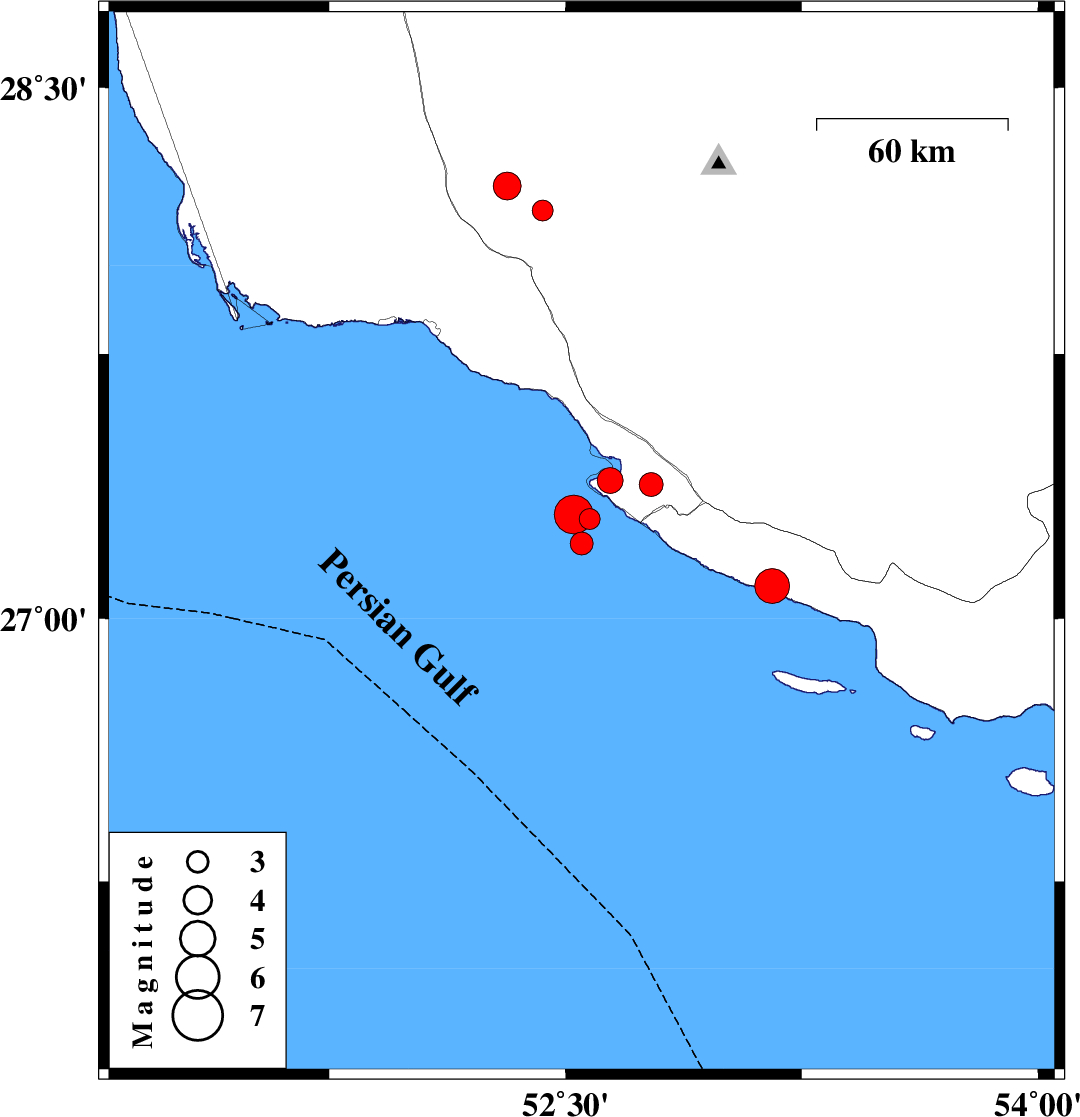 | 2026/02/01 | 05:11:18.2 | 08:41:18.2 | 27.296 | 52.526 | 12 | ML:5.5 | Persian Gulf, 45 km South-West of Mehr | ||