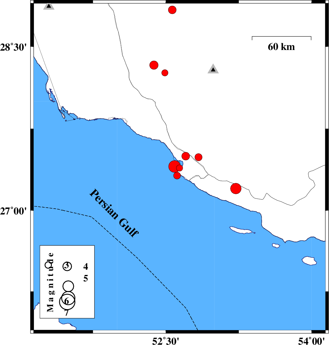 | 2026/02/01 | 05:11:18.2 | 08:41:18.2 | 27.296 | 52.526 | 12 | ML:5.5 | Persian Gulf, 45 km South-West of Mehr | ||