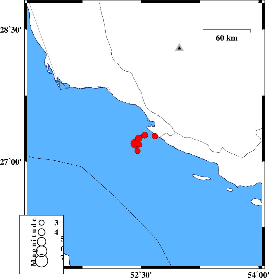 | 2026/02/01 | 05:11:18.2 | 08:41:18.2 | 27.296 | 52.526 | 12 | ML:5.5 | Persian Gulf, 45 km South-West of Mehr |