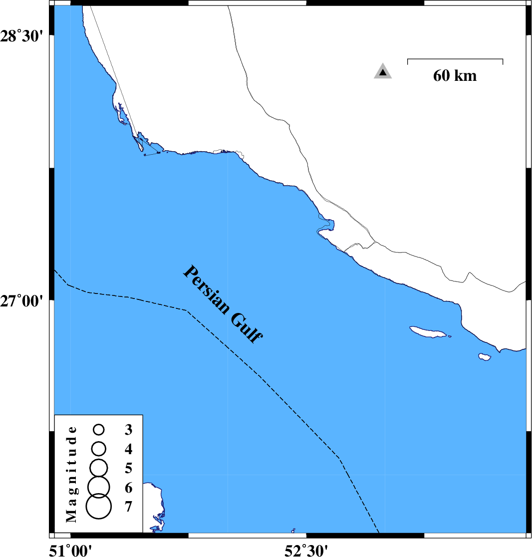 | 2026/03/17 | 06:59:37.0 | 10:29:37.0 | 27.166 | 52.397 | 12 | ML:4.3 | Persian Gulf, 75 km South of Jam |