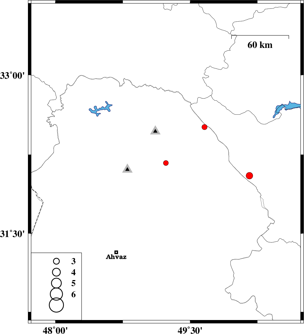 | 2006/06/01 | 23:45:18.1 | 03:15:18.1 | 32.17 | 49.23 | 18 | ML:2.6 | 26 km North of Masjed Soleyman, Khoozestan Province | ||