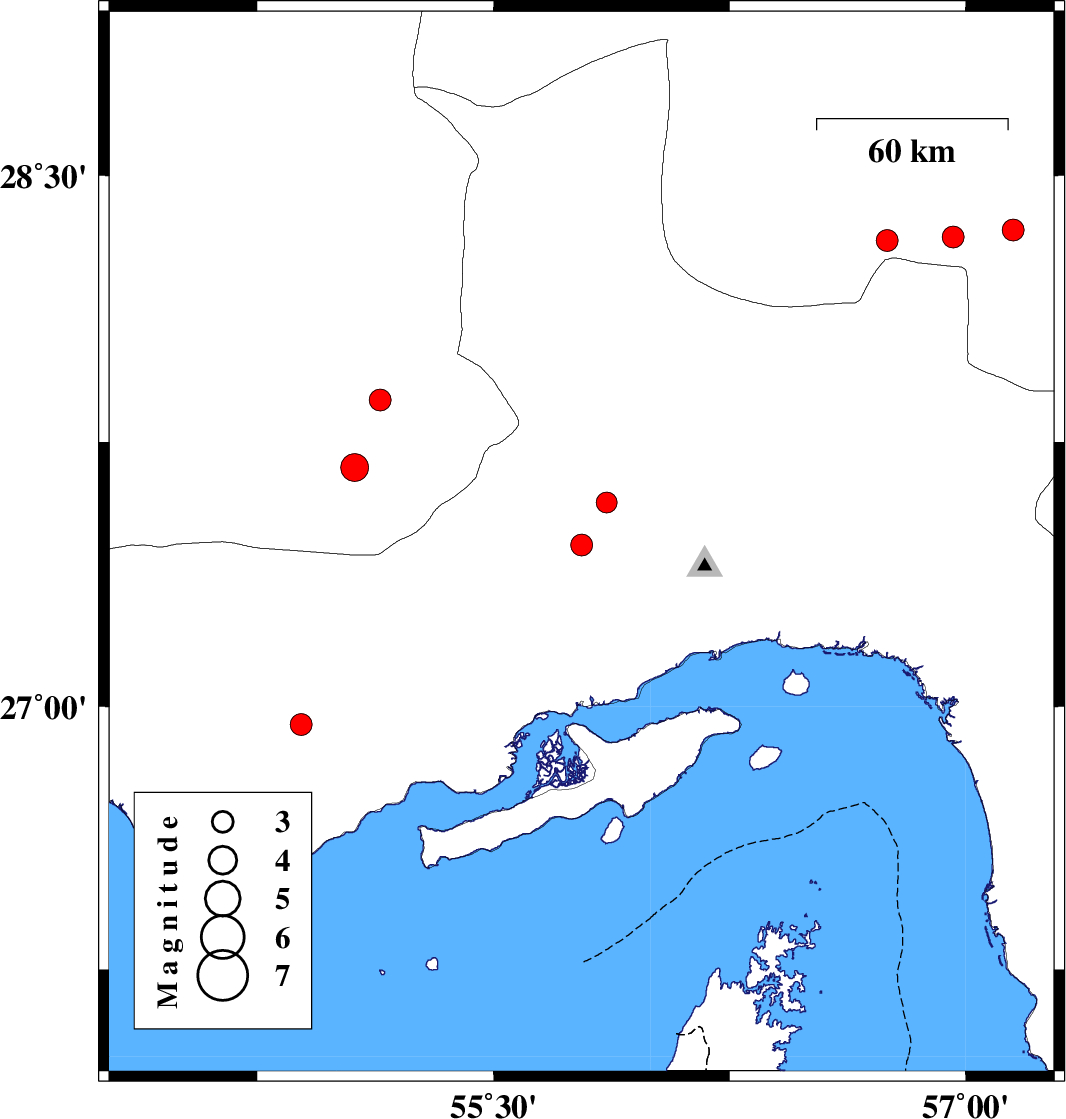 | 2006/05/27 | 12:11:21.3 | 15:41:21.3 | 27.46 | 55.78 | 18 | ML:2.9 | 57 km North-West of Bandar-e abbas, Hormozgan Province | ||