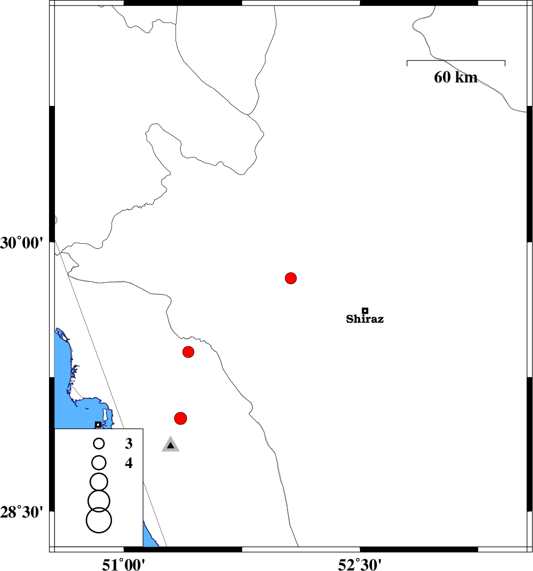 | 2006/06/29 | 18:41:31.8 | 22:11:31.8 | 29.02 | 51.36 | 18 | ML:3.5 | 18 km North-East of Ahram, Bushehr Province |